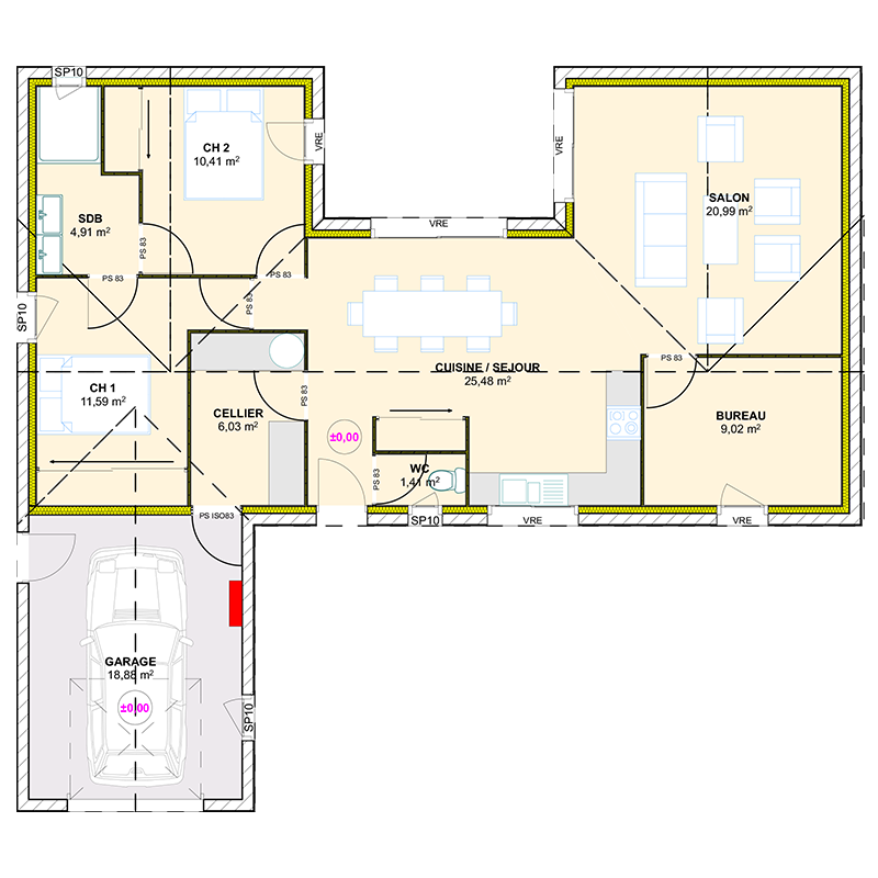Cette maison de plain-pied de 89,64 m² est très bien conçue. Elle offre un bel espace à vivre lumineux de 46 m², une cuisine ouverte et de deux belles chambres, une salle de bain spacieuse toute équipée, un garage. Pour toutes questions sur ce type de construction, n'hésitez pas à nous contacter.