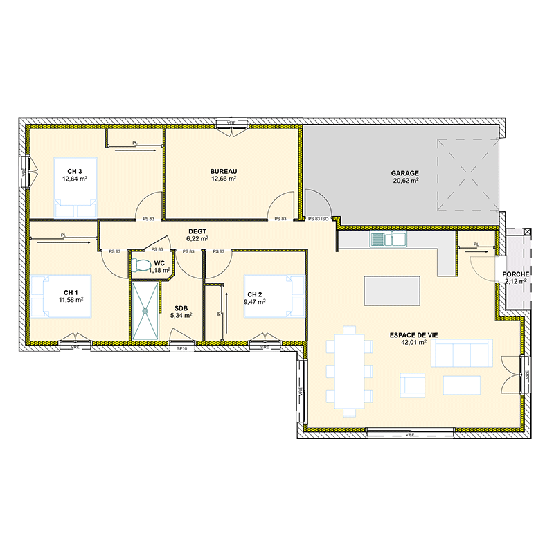 Vous serez séduit par cette belle maison de 101,10 m² . Cette maison RT 2012 vous propose un plan de maison très bien étudié : un salon - séjour de 42 m² très lumineux grâce à ses nombreuses ouvertures, une cuisine ouverte et une arrière-cuisine. L'espace est entièrement optimisé et rend cette maison très fonctionnelle. Cette maison est idéale pour une famille puisqu'elle offre 3 belles chambres.